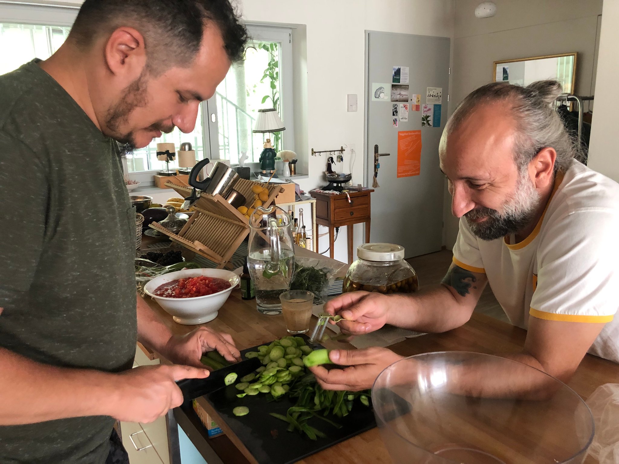 Als Erstes können wir natürlich sagen, dass der Schweizer Käse wirklich lecker ist. Ausserdem ist es schwierig, in Istanbul einen guten Speck zu finden, also nutzen wir diese Gelegenheit hier. Und wir haben zum ersten Mal Polenta gegessen, die hat uns sehr gut geschmeckt. Meringues sind auch in der türkischen Küche zu finden, aber mit Greyerzer Doppelrahm und Glacé schmeckt es viel besser. Natürlich haben wir auch verschiedene feine Luzerner Biere probiert. Wir haben aber auch für unsere Schweizer Freund:innen einige Gerichte aus der türkischen Küche gekocht, "acılı ezme" (ein würziges Tomatenmeze) und «çılbır», das nicht einmal Gabi Kopp kannte ; ) Wir verraten Euch hier aber das Rezept! (s. unten)