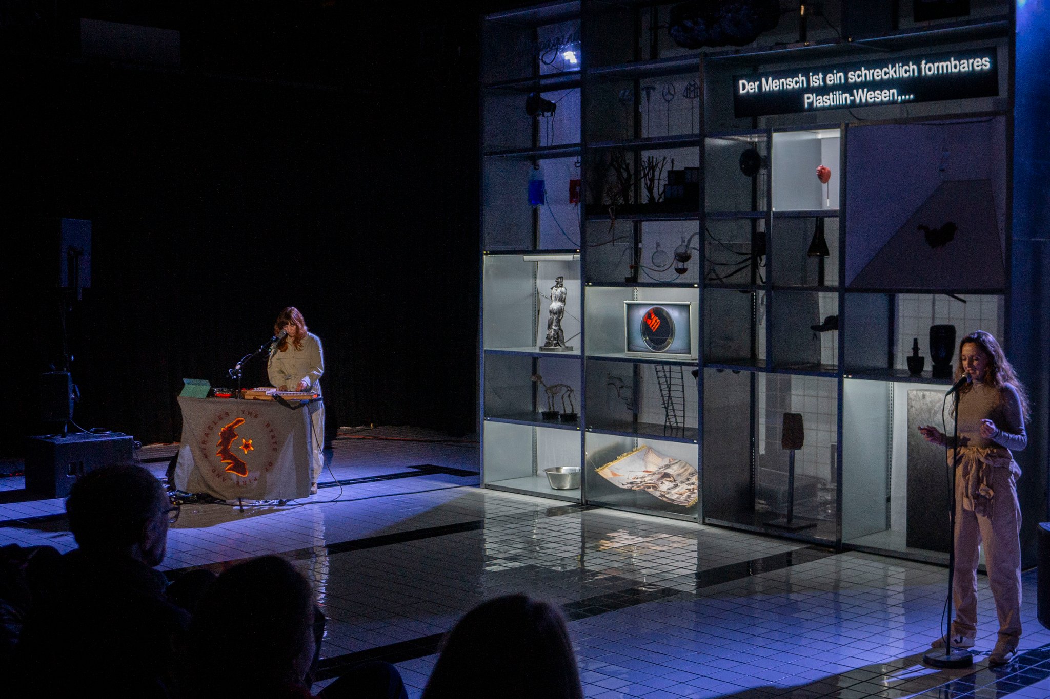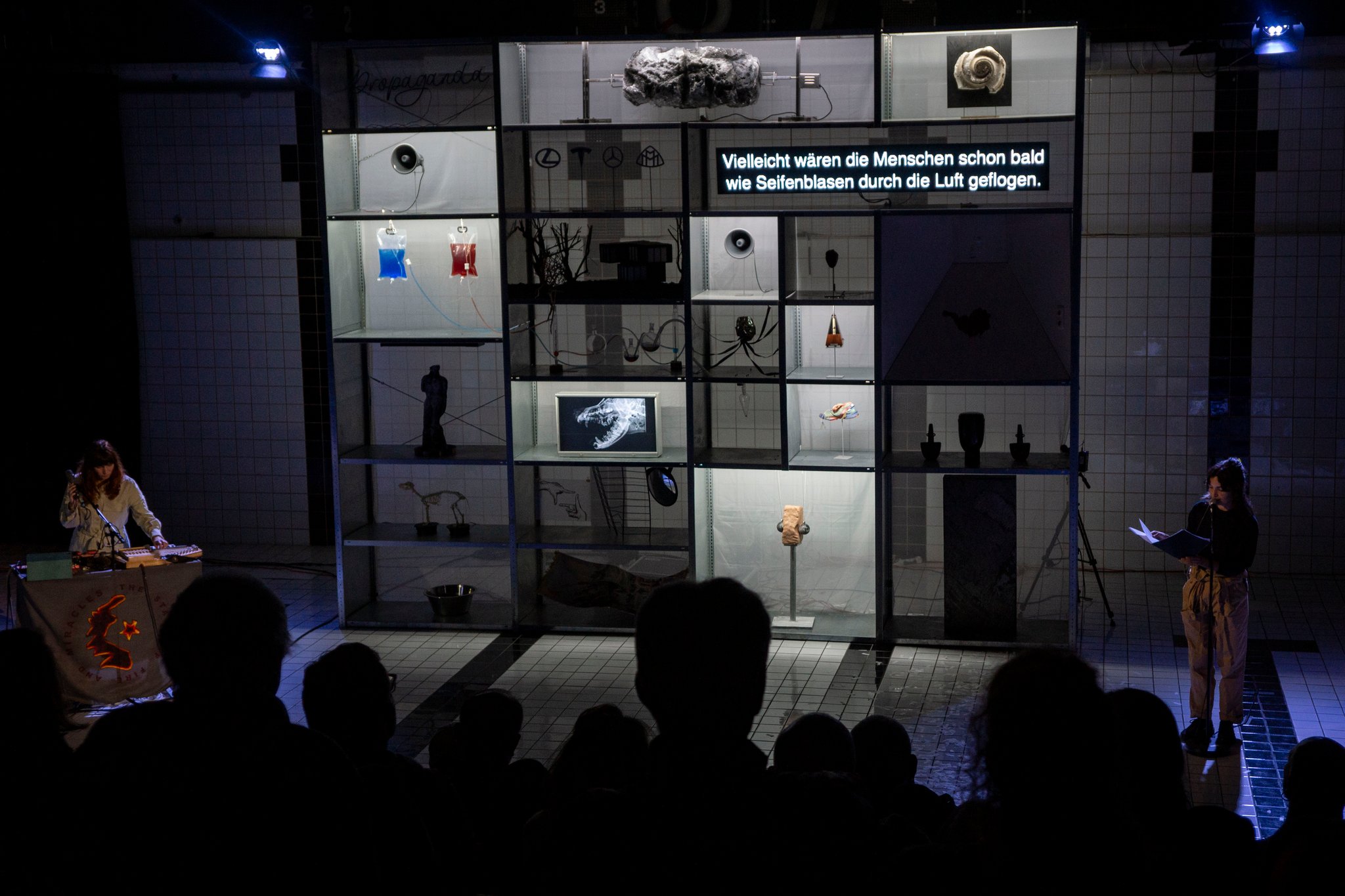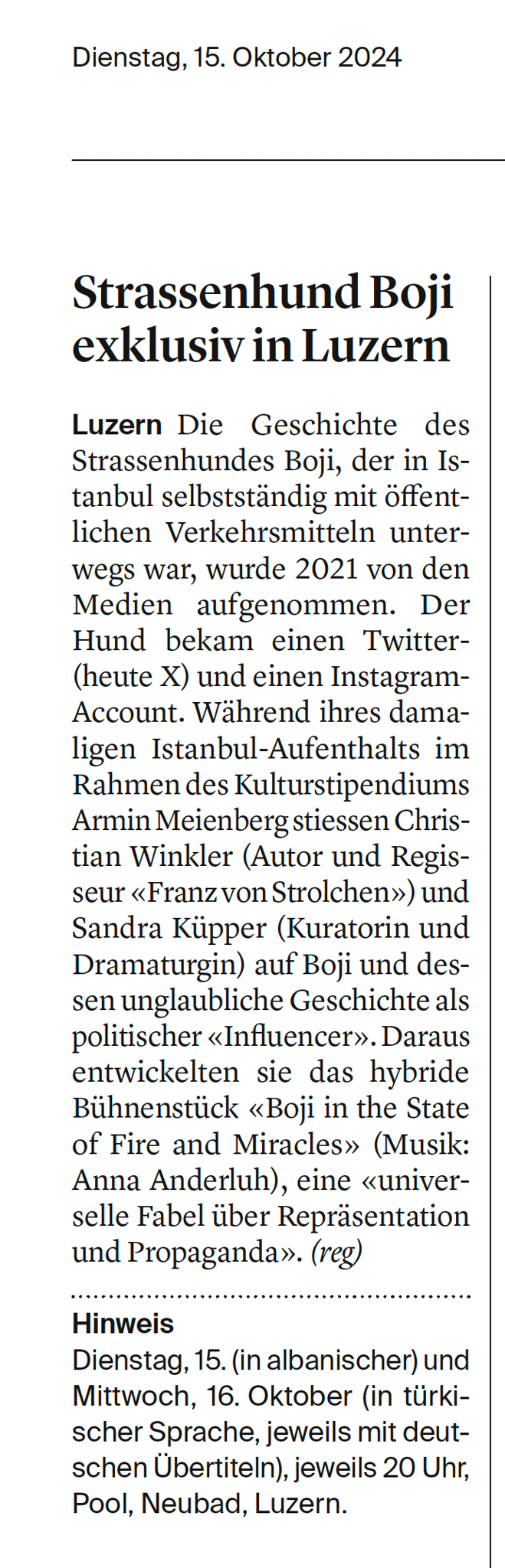 «Boji in the State of Fire and Miracles» ist eine universelle Fabel von Franz von Strolchen, alias Christian Winkler, die mit Christians und Sandra Küppers Stipendiumsaufenthalt im Herbst 2021 begann. Nachdem das Bühnenstück in Graz auf Begeisterung stiess und mit dem «Grazer Rüssel» – dem Theaterpreis der freien Szene – ausgezeichnet wurde, konnten wir das Bühnenwerk an zwei (individuellen) Abenden im Luzerner Neubad präsentieren. Am ersten Abend wurde das Stück von Albana Agaj auf Albanisch gesprochen, am zweiten Abend auf Türkisch von Selin Dettwiler.